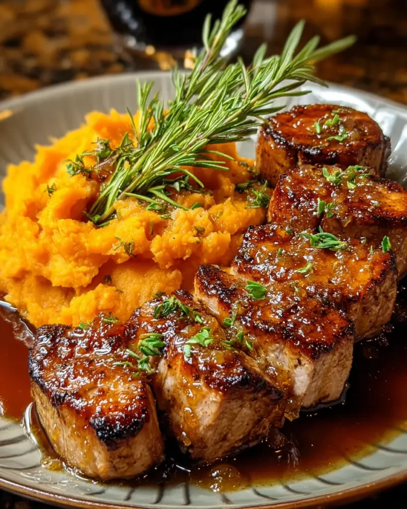 A delicious combination of tender pork medallions soaked in apple cider, served with creamy mashed sweet potatoes.