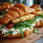Now it’s time to bring it all together! Spread the goat cheese mixture generously on the bottom halves of the croissants. Layer on those thin apple slices, and sprinkle a handful of fresh arugula if using. Finally, cap them with the top halves of the croissants. Voila! Your sandwiches are almost ready.