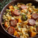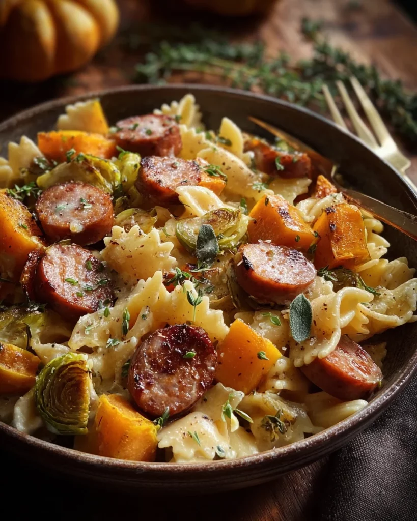 Autumn Sausage Pasta Squash is a cozy comfort dish that combines roasted butternut squash and Brussels sprouts with bow tie pasta and smoked sausage for a flavorful meal.