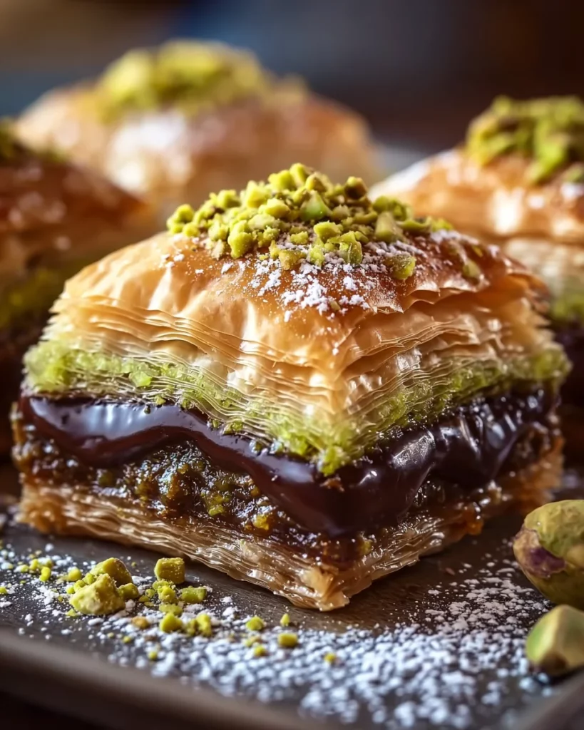 Let’s bring this masterpiece together! Start by placing one of your baked phyllo sheets on a flat surface. Spread a generous layer of the delightful pistachio cream over it, letting it reach all edges. Next, spoon that luscious chocolate ganache right on top, making sure to cover it evenly. Finally, gently place another phyllo layer on top of this decadent filling. Don’t rush this step; your delicious layers deserve attention! The symmetry of flavors and textures will have your taste buds doing a happy dance!