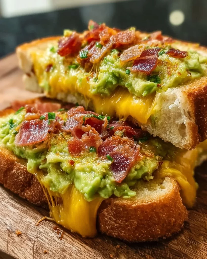 A delicious melt featuring crispy bacon, creamy guacamole, and gooey cheese sandwiched between crispy sourdough bread.