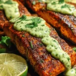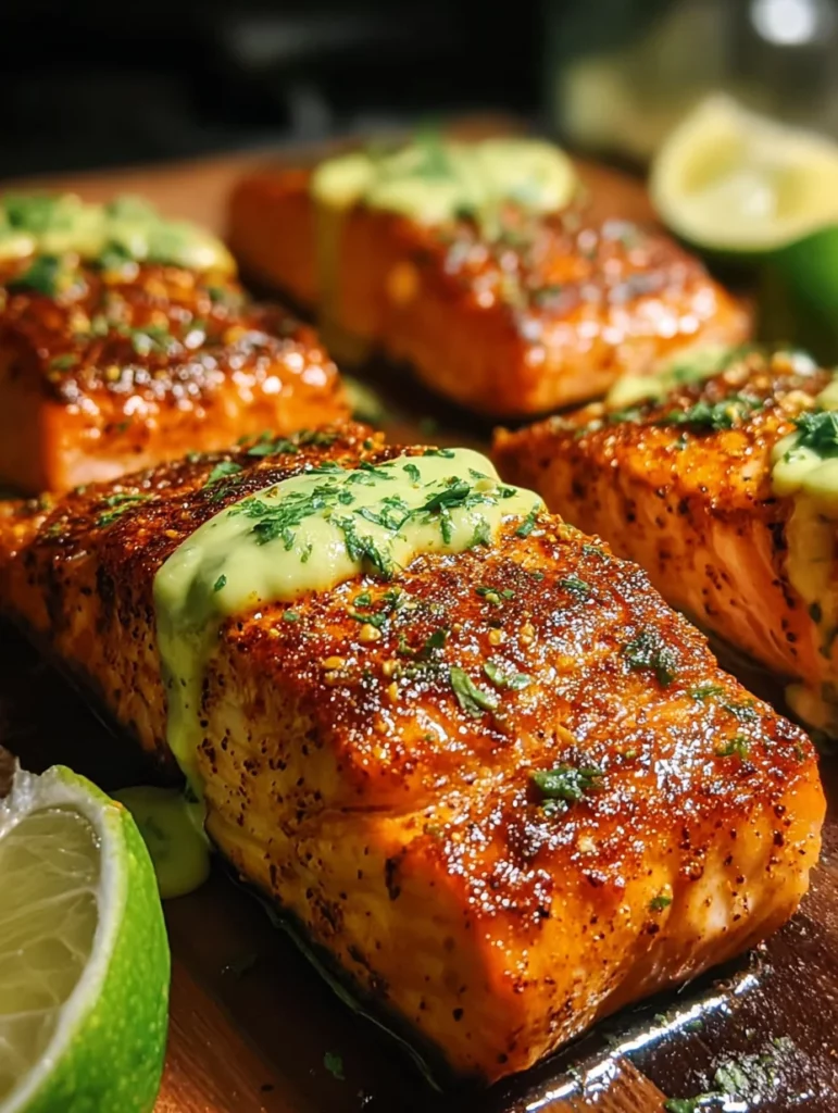 Baked Cajun Salmon with a delicious creamy avocado lime sauce, offering a perfect blend of flavors.