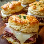 It’s time to lay down the good stuff. Place slices of delectably thin roast beef and halved provolone cheese on top of each biscuit bottom. Don’t be shy—load them up! The combination of savory beef and gooey cheese is what makes these Baked French Dip Biscuits truly irresistible.