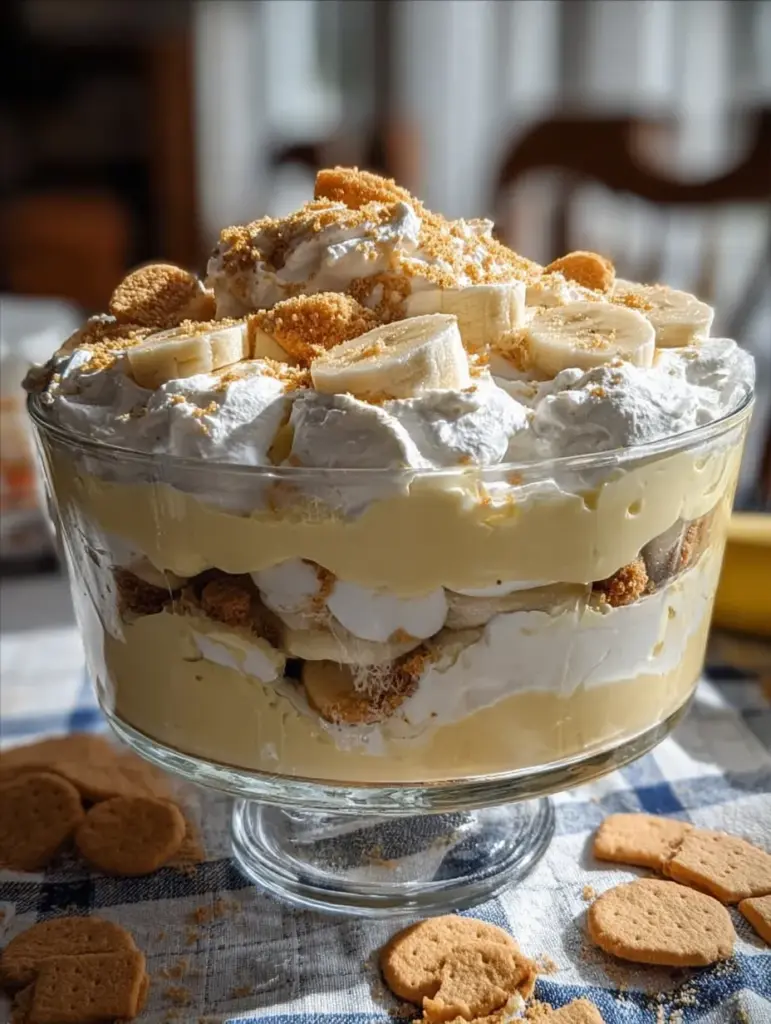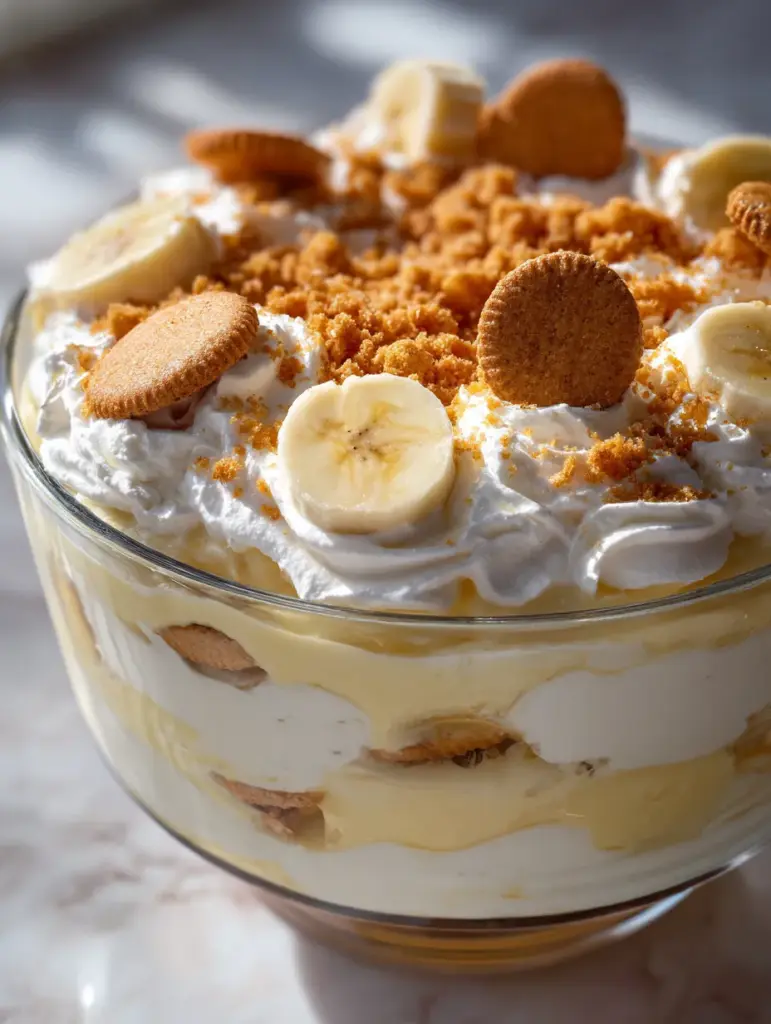 Presentation matters, especially for a dessert this beautiful. A clear trifle bowl is perfect because it shows off every delicious layer: the pudding, bananas, wafers, and whipped topping. If you don’t have one, any deep glass bowl will do. But trust us—people eat with their eyes first. This dessert needs to be seen.