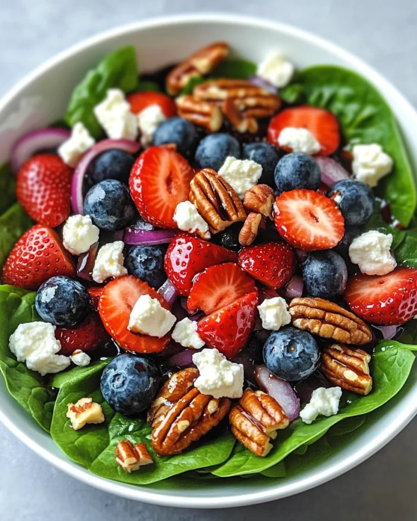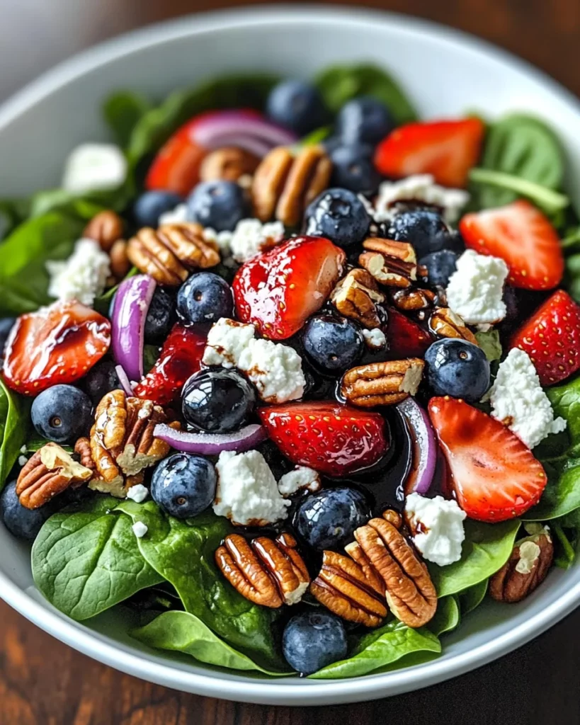 A refreshing salad featuring fresh spinach, mixed berries, toasted pecans, crumbled feta cheese, and a tangy balsamic glaze.