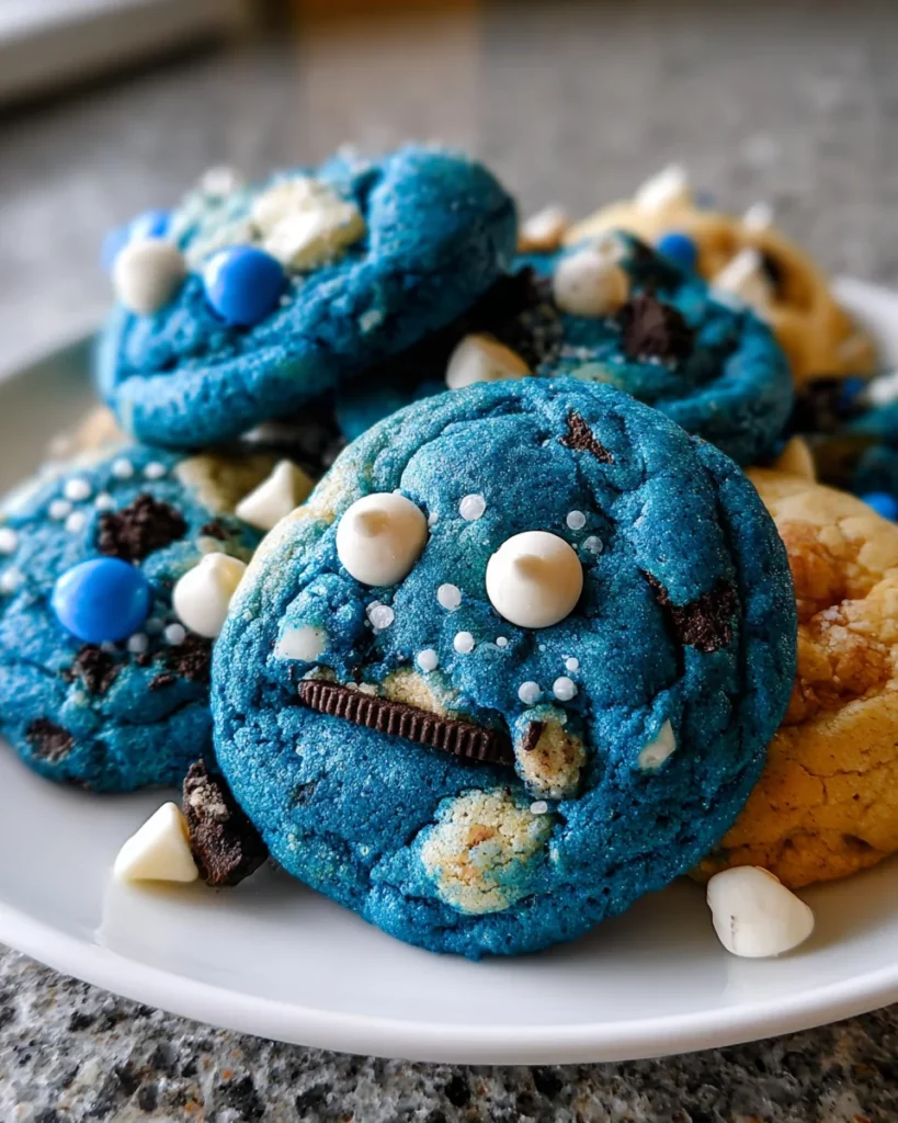 Blue Monster Cookie Treats are fun and colorful cookies that combine the flavors of Oreo and Chips Ahoy, with a vibrant blue hue that makes them visually appealing.