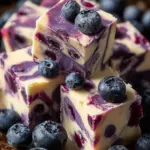 When the fudge is firm, carefully lift it out of the pan using the parchment overhang. Place it on a cutting board and slice it into squares—36 pieces to be exact! As you cut, you’ll see that delightful marbling of blueberries against the creamy white chocolate. Serve them up, and watch your family and friends fall in love with every creamy, fruity bite!
