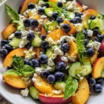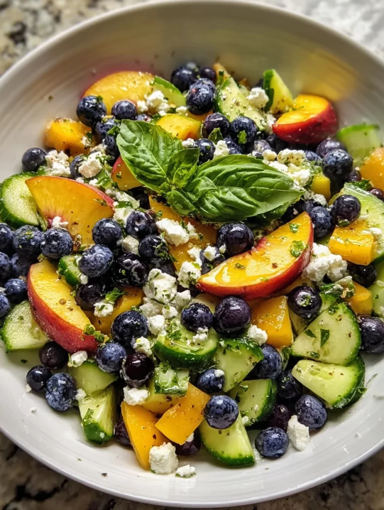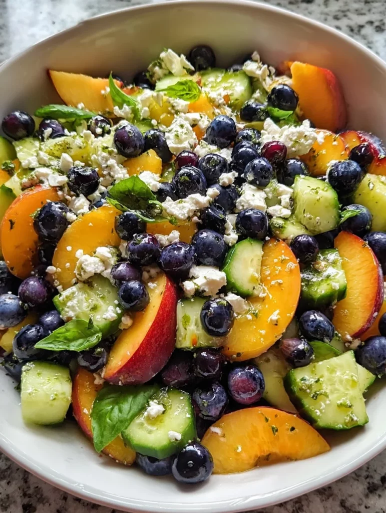 A refreshing salad featuring the delightful combination of blueberries, peaches, and feta cheese, perfect for summer gatherings.