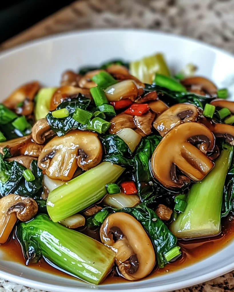 A quick and delicious stir fry dish featuring vibrant bok choy and hearty cremini mushrooms.