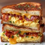 The first bite cracks the golden crust with a cheerful crunch, and warm, molten cheese spills into the steam of freshly scrambled eggs and crisp bacon. Buttered sourdough browns to an irresistible caramel color, filling the kitchen with a toasty, slightly nutty aroma that begs you to sit down and savor every layered mouthful. This sandwich feels like the most indulgent, cozy morning you can wrap in two slices of bread.