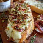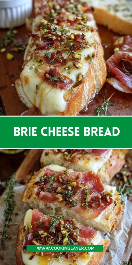 A delicious and indulgent Brie Cheese Bread topped with crispy prosciutto, roasted pistachios, and a drizzle of hot honey, perfect for sharing or enjoying as a savory snack.