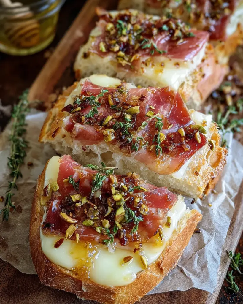 - Remove bread from oven. Immediately drizzle hot honey over the surface, then evenly sprinkle with chopped prosciutto, crushed pistachios, thyme, and sea salt. Using a sharp knife, slice carefully and serve warm.