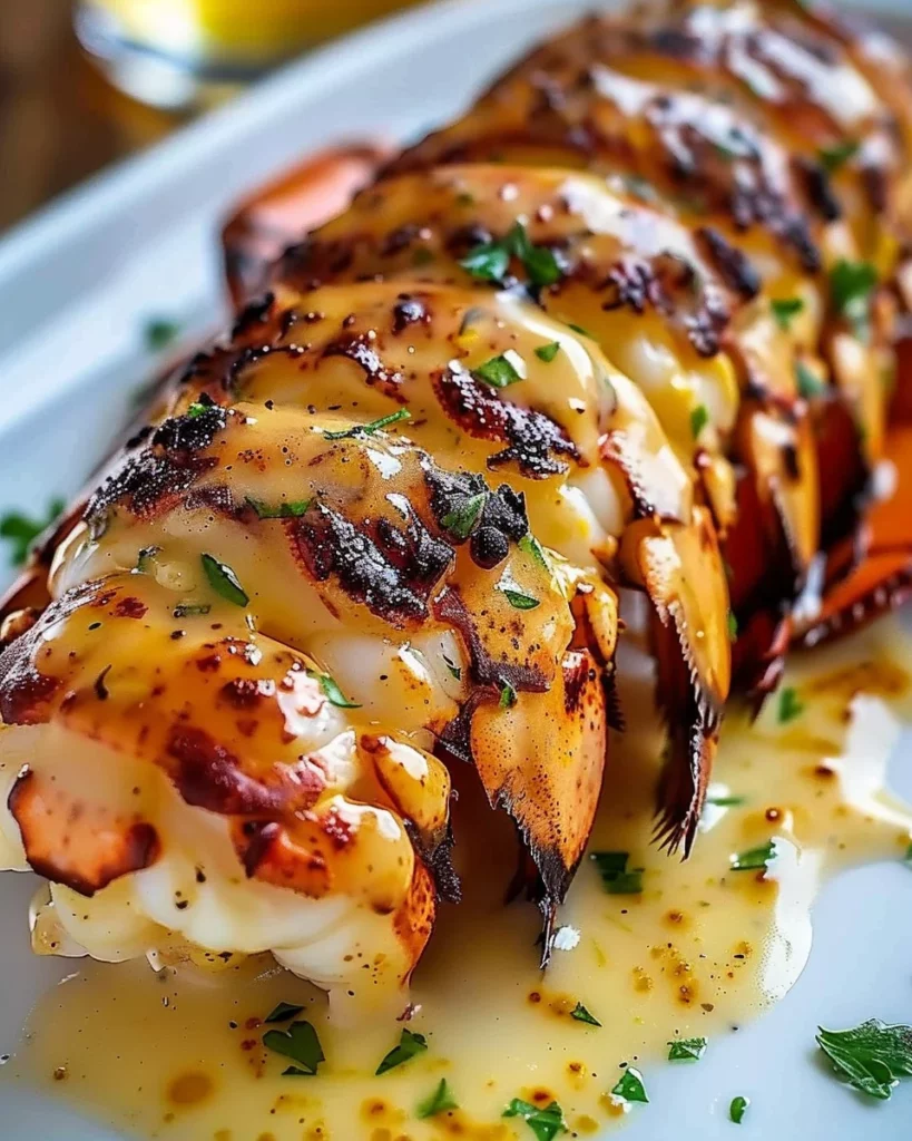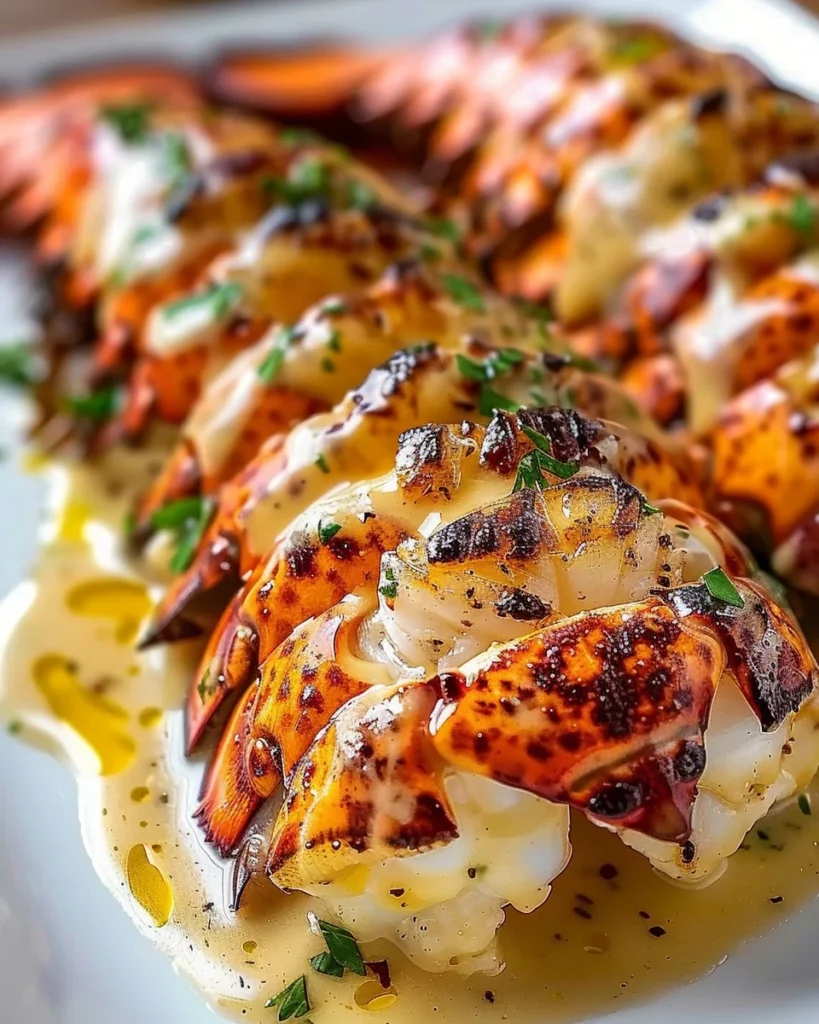 Indulge in a gourmet meal with butter-seared lobster tails topped with a creamy garlic sauce, perfect for special occasions.