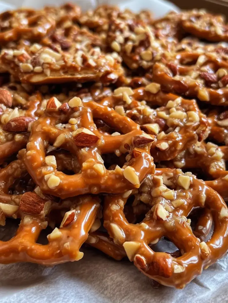 They’re like a homemade version of a gourmet candy bark but with the structure of snacky, munchable pretzels. The image we’re working from? It’s all golden and glossy, with those perfect nuggets of almond or pecan tucked into every nook and cranny of caramel-coated pretzels. Absolute perfection.