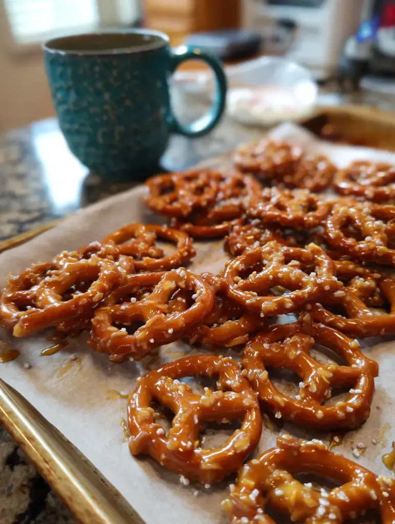Pro tip: Don’t crowd the pretzels. You want an even layer, not a mountain, so everything gets a good bake.