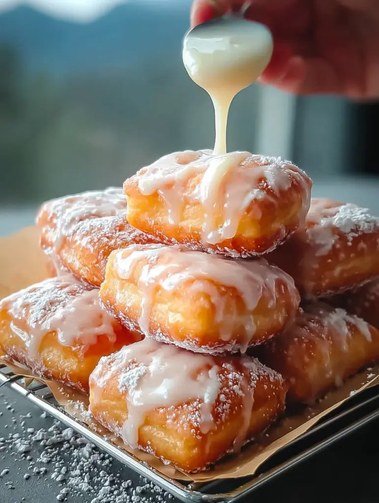 🍩✨ Soft, thick, bakery-style beignet squares with golden edges and a tender, pillowy center! Finished with a smooth vanilla glaze that sets into a delicate sugary shell — cozy, nostalgic, and picture-perfect with every bite 🤍☕