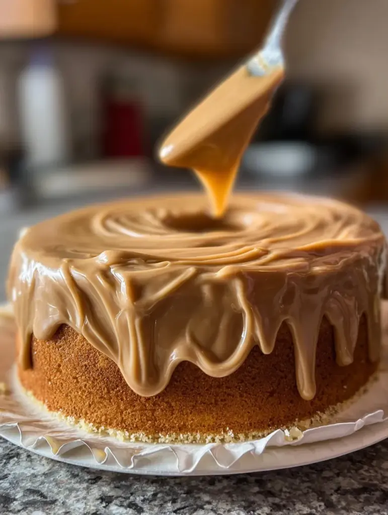 Each spoonful of caramel is like liquid gold, clinging lovingly to the cake’s golden surface. It doesn’t just sit there; it becomes part of the cake — melding into every crevice, soaking into the crumb, and creating a bite that’s pure Southern poetry.