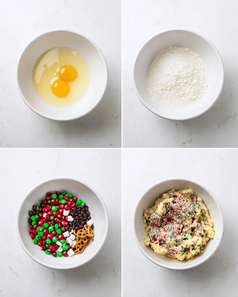 - Fold in the M&Ms, chocolate chips, mini marshmallows, crushed pretzels, and sprinkles.