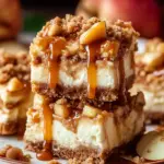 Delicious caramel apple cheesecake bars featuring a creamy cheesecake layer topped with spiced apples and a crunchy streusel, drizzled with homemade caramel sauce.