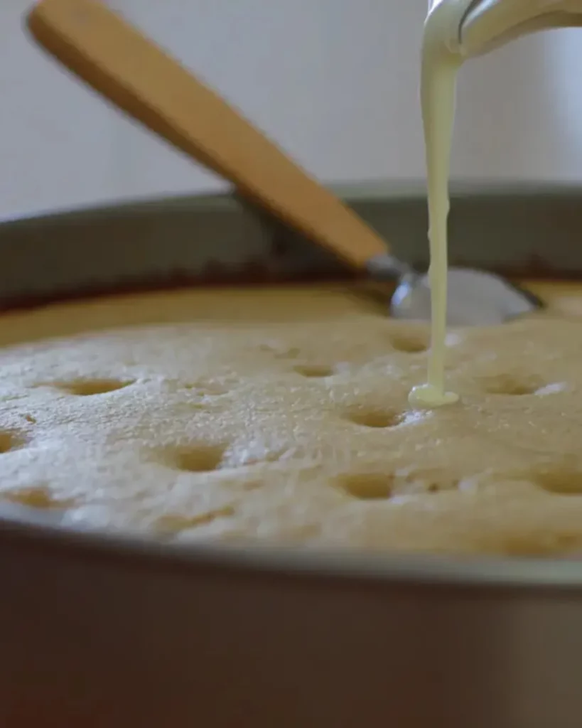 Pour condensed milk slowly over the warm cake, letting it soak into the holes. (⏱ 5 minutes)
