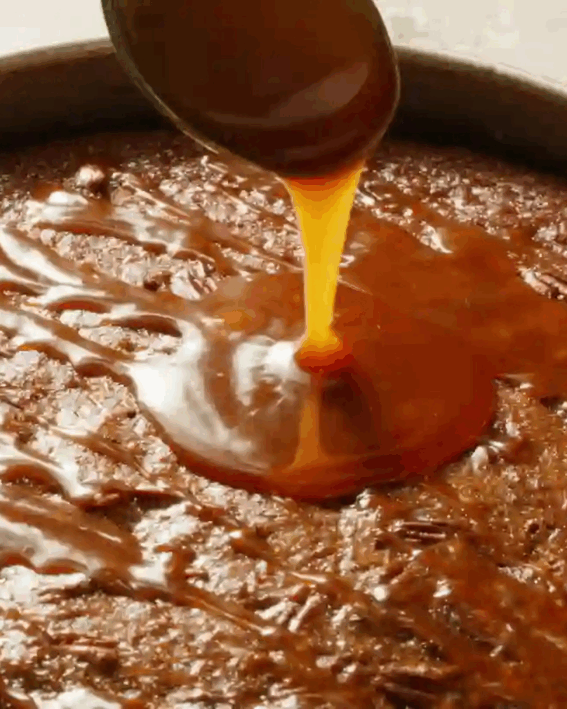 🍰 A dreamy Southern-style dessert that melts in your mouth! ✨ Moist cake filled with caramel sauce, topped with a creamy praline frosting and crunchy pecans. Pure indulgence in every bite! 😍🥄