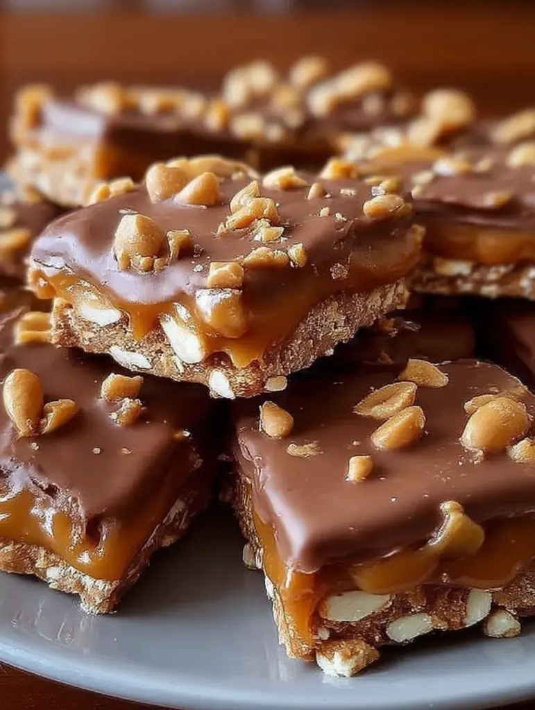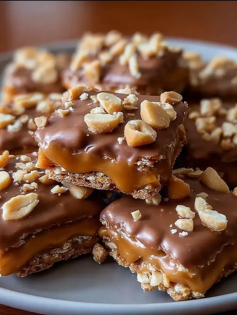The contrast between buttery crackers, rich caramel, smooth chocolate, and crunchy peanuts makes every bite addictive and memorable.