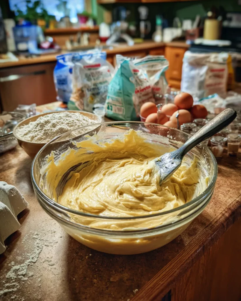 The batter will be thick and creamy, perfect for baking into a soft cake crumb.