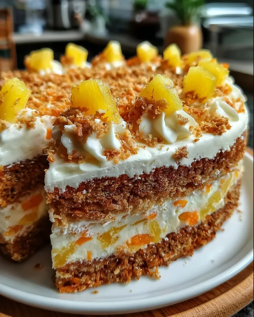 Once the cake has cooled, it’s frosting time! Spread that creamy frosting generously over the top. Don’t be shy—make it as thick or thin as you like! For that final touch, decorate with fresh pineapple chunks and a sprinkle of finely shredded carrots. This adds a charming look, making your Carrot Pineapple Delight irresistibly eye-catching!