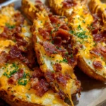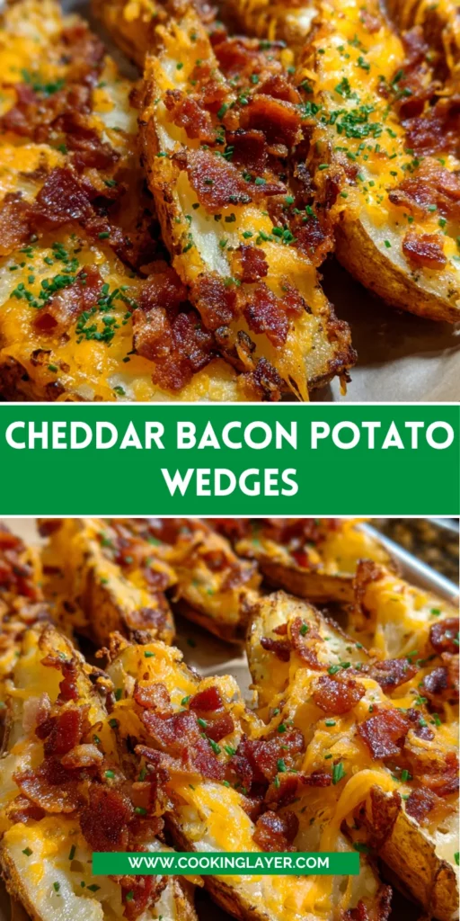 Crispy Cheddar Bacon Potato Wedges topped with melted cheese and crumbled bacon, perfect as a side dish or snack.