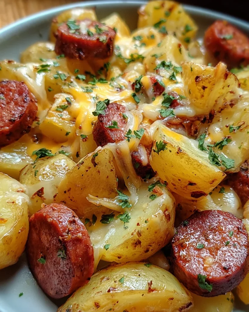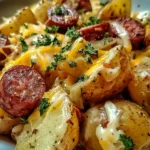Cheesy Ranch Potatoes and Smoked Sausage are irresistible! This comforting dish combines savory smoked sausage with tender baby potatoes, all coated in a rich ranch seasoning and topped with melted cheddar cheese.