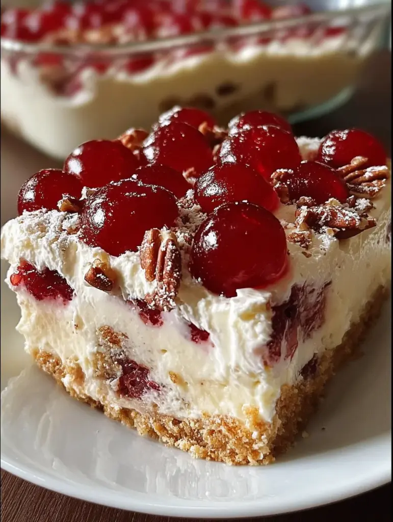 🍰 A soft, dreamy no-bake delight layered with creamy cheesecake, smooth pudding, toasted pecans, and a glossy cherry topping. This is one of those desserts that disappears before you even set the pan down. 💖 Sometimes the simplest treats bring the biggest smiles — especially when they taste like pure comfort. 😍