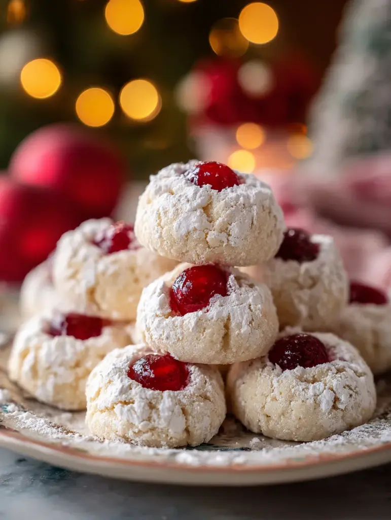 🍒❄️ Soft, buttery, melt-in-your-mouth shortbread cookies crowned with sweet maraschino cherries and finished with a snowy dusting of powdered sugar. A festive bite that brings holiday magic to any dessert table! ✨🍪