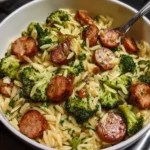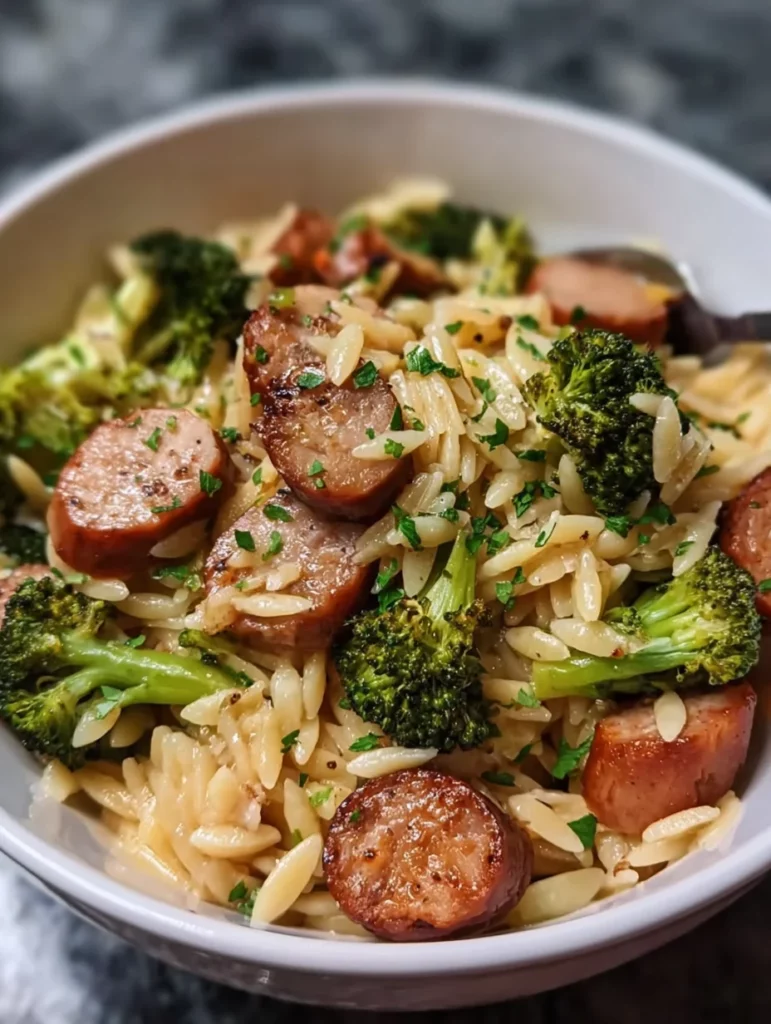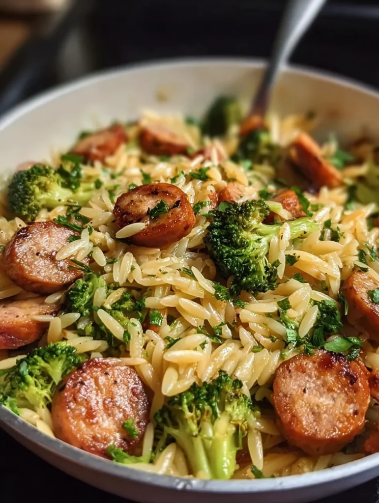 A delicious one-pot meal featuring chicken sausage and broccoli with orzo pasta, perfect for a hearty dinner.