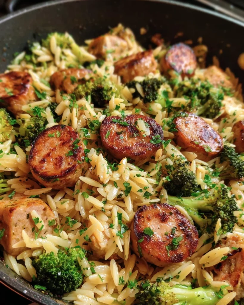 A quick and easy recipe featuring chicken sausage, orzo pasta, and broccoli, all cooked in a savory broth.