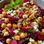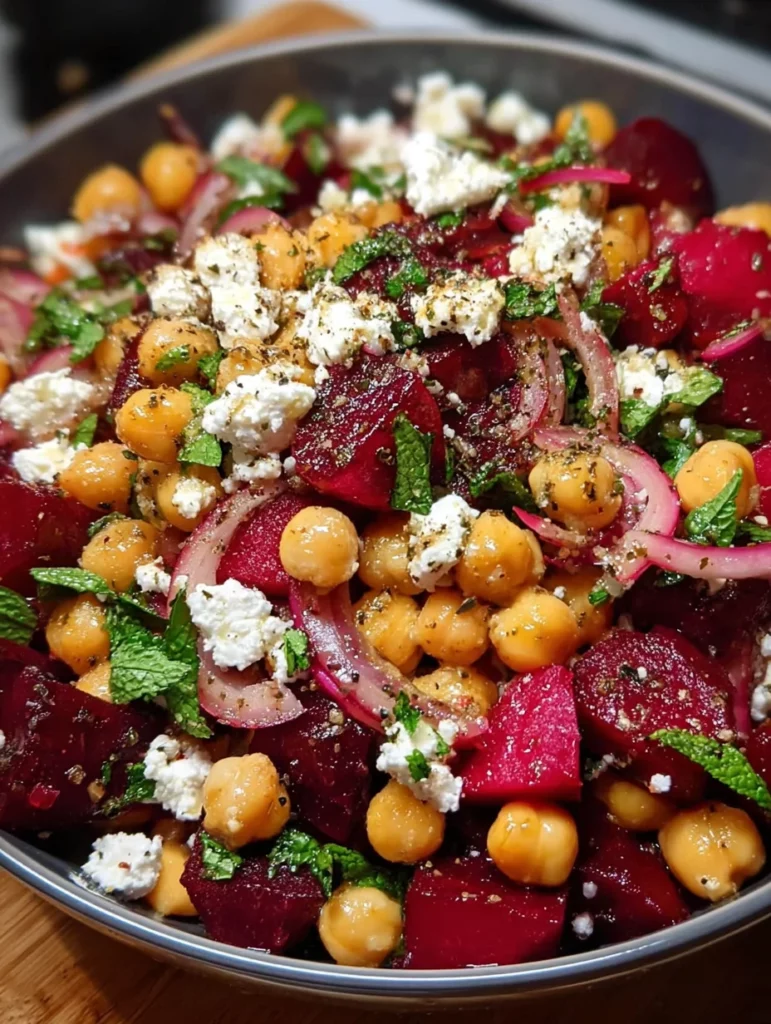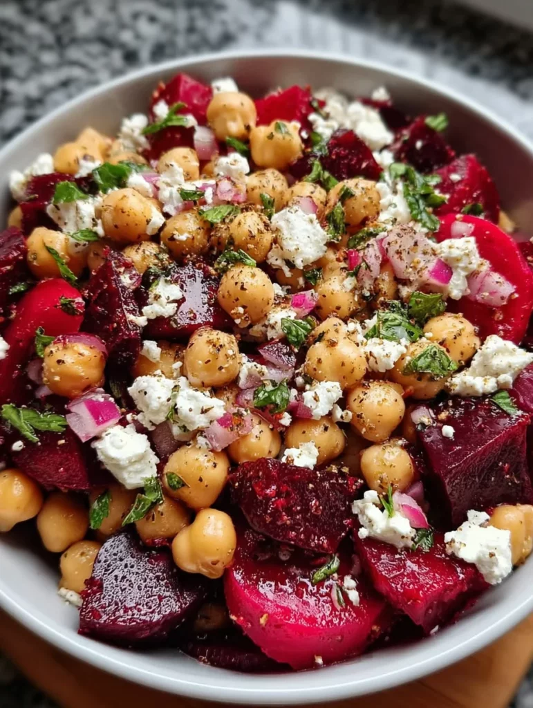 A refreshing and nutritious salad combining chickpeas, roasted beets, and feta cheese, perfect for a light meal or side dish.