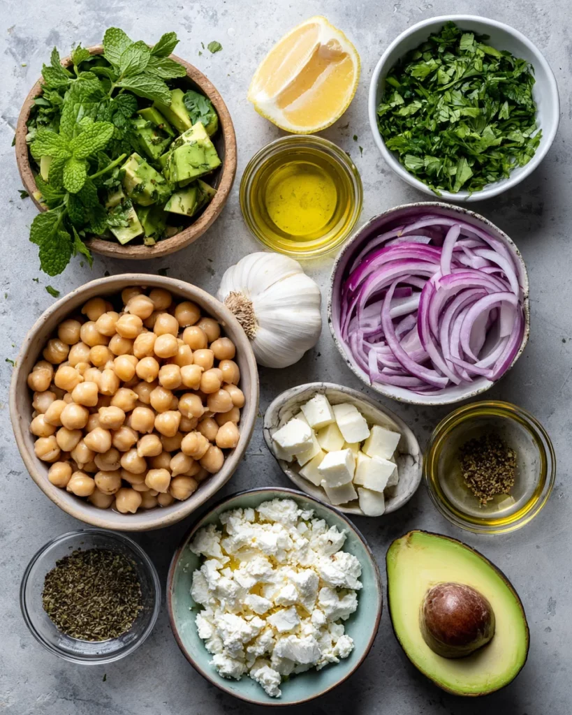 - In a large bowl, combine the drained chickpeas, diced avocado, crumbled feta cheese, thinly sliced red onion, chopped parsley, and chopped mint.
