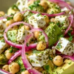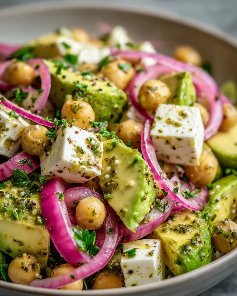 A refreshing and nutritious salad made with chickpeas, feta cheese, and avocado, perfect for a healthy meal.