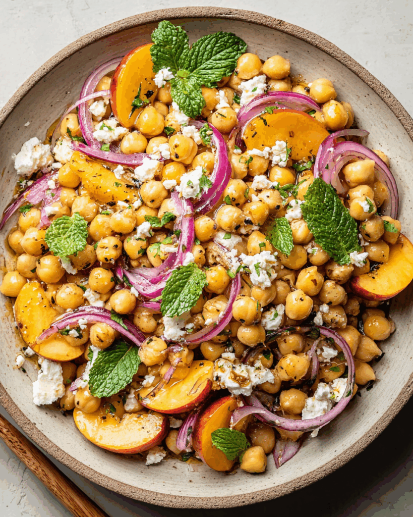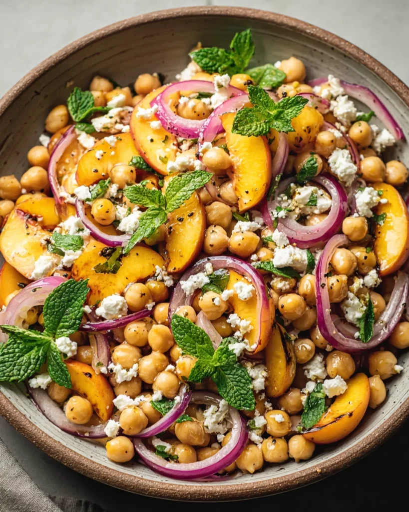 - In a large mixing bowl, combine the rinsed and drained chickpeas, diced peaches, thinly sliced red onion, diced cucumber, and chopped fresh mint leaves. If using, add the crumbled feta cheese.