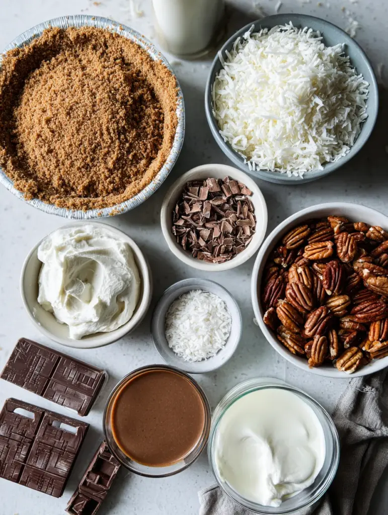 In another bowl, mix shredded coconut, chopped pecans, sweetened condensed milk, melted butter, vanilla extract, and a pinch of salt. Stir until perfectly blended. 🥥🌰Layer and Chill (4 hours):