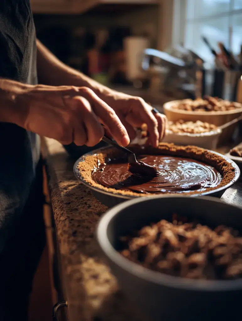 Pour the chocolate mixture into your prepared graham cracker crust. Spread evenly with a spatula to form a smooth base.