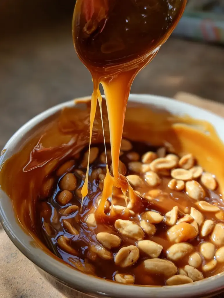 Stir in roasted peanuts until every nut is coated in that golden, gooey caramel goodness. This step smells heavenly, by the way.