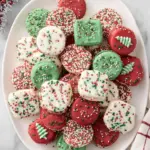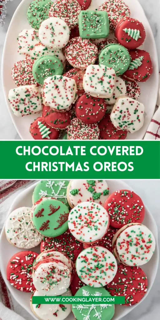 Chocolate Covered Christmas Oreos are festive treats perfect for the holiday season, combining the classic Oreo cookie with colorful candy melts and sprinkles.