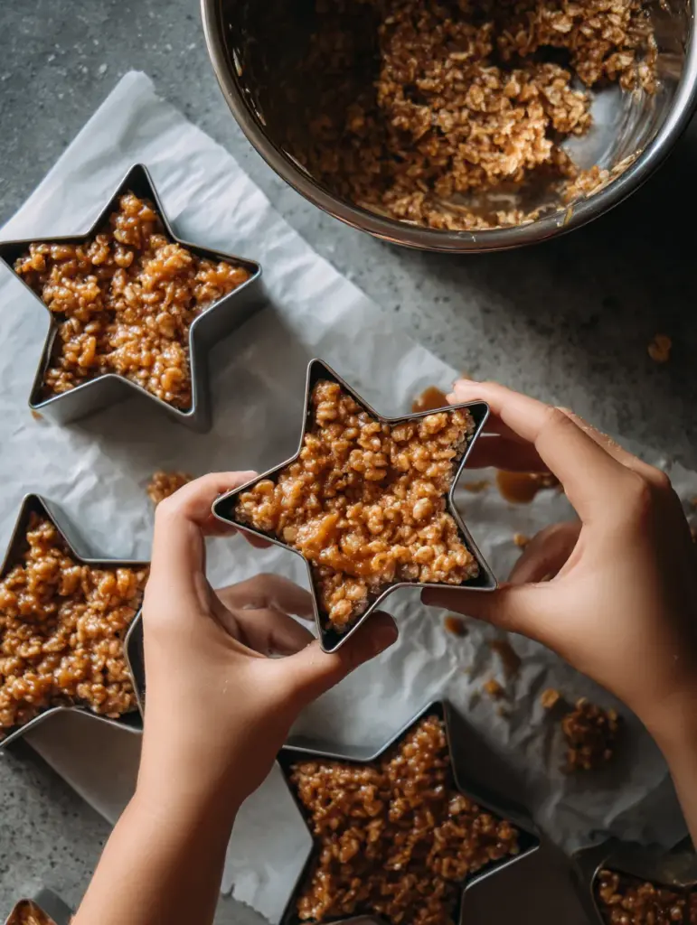 - If using a cookie cutter: Lightly grease the inside with oil or butter. Press the warm caramel-cereal mixture firmly inside, then lift the cutter to reveal a clean star shape.
