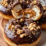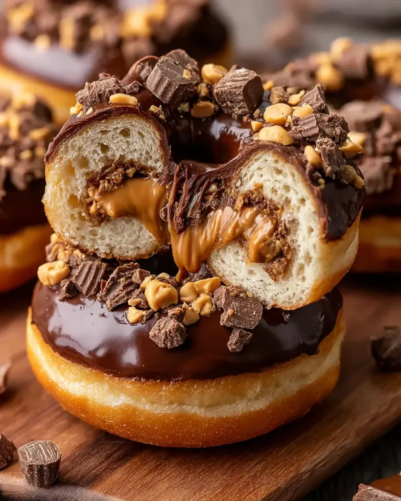 Delicious chocolate donuts filled with creamy peanut butter and topped with a rich chocolate glaze and chopped peanut butter cups.