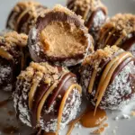 What’s a Chocolate Peanut Butter Snowball without a little caramel love? In another microwave-safe bowl, melt the soft caramel candies with a splash of heavy cream or milk, warming it in 10 to 15-second intervals. Once smooth, use a piping bag or a spoon to drizzle the luscious caramel over your chocolate-coated balls generously. You can sprinkle sea salt flakes immediately afterward for an added crunch and flavor explosion!