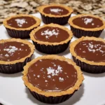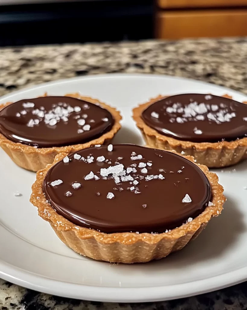 - Assemble the tarts: Spoon the cooled caramel into each tart shell, filling them halfway. Chill the tarts for 20 to 30 minutes until the caramel sets. Then, pour the chocolate ganache on top of the caramel layer. Finish with a sprinkle of flaky sea salt. Refrigerate for at least 2 hours before serving to let everything set beautifully.