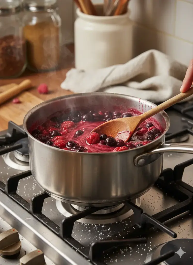 Duration: ~1 hour 15 minutesIn a saucepan, combine mixed berries, sugar, and lemon juice. Heat until juicy and simmering. Add the cornstarch slurry and cook 2–3 minutes until thick and glossy. Let cool completely.