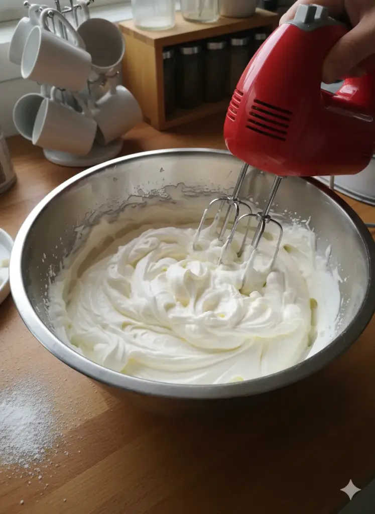 - Beat to Glossy Peaks: Look for thick, glossy peaks that don’t drip off the whisk.