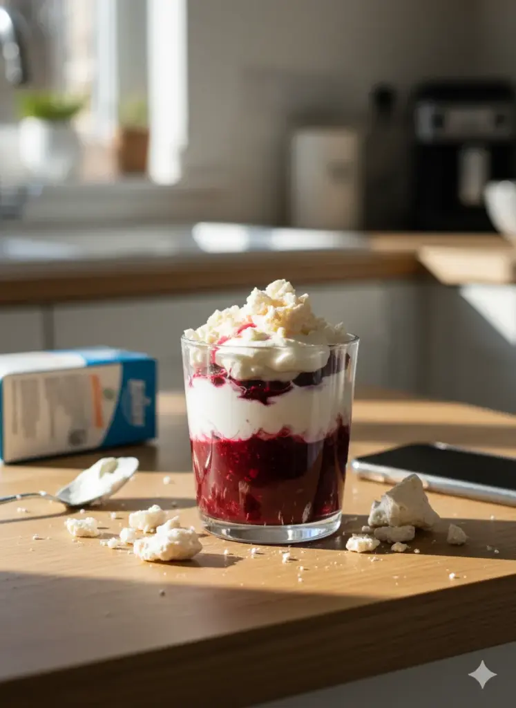 Spoon in a generous base of the ruby-red berry compote. Make sure it spreads all the way to the edges so you can see that deep, glossy color through the glass. - Second Layer: Whipped Cream