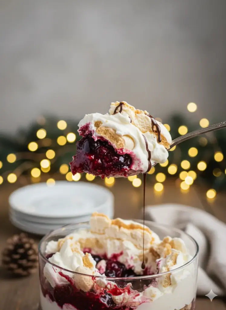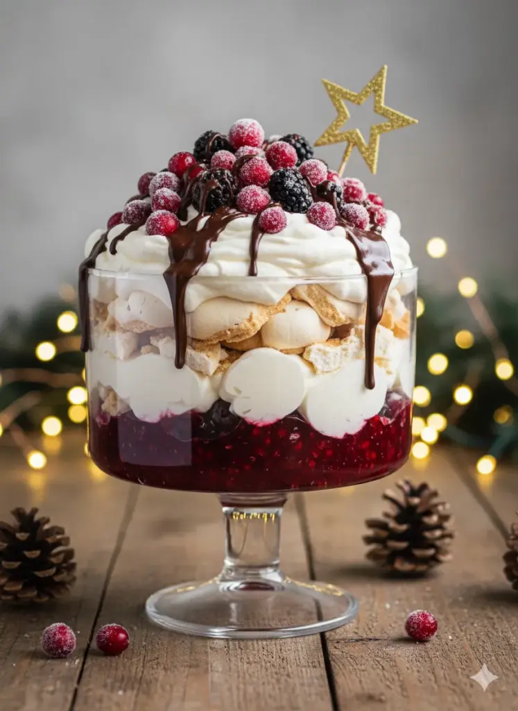 Imagine a glass trifle dish layered with snowy peaks of whipped cream, deep red glossy berries, golden-crisp pavlova shards, and sugared fruits that sparkle like morning frost. One spoonful? It’s like unwrapping a sweet surprise on Christmas morning.